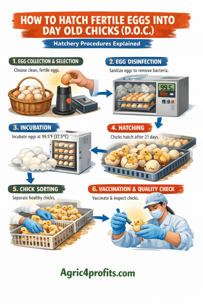 Le voyage de l’oeuf fertile pour une bonne santé, vaccinés, et prêts pour le marché day-poussin passe par plusieurs soigneusement géré étapes: la collecte des œufs et la sélection, la fumigation, le stockage à froid, l’incubation, les bougies, transfert à l’hatcher, l’éclosion, et enfin la vaccination. Chaque étape doit être géré correctement pour le processus de production de poussins de la qualité que les agriculteurs ont besoin pour démarrer une productives troupeau.