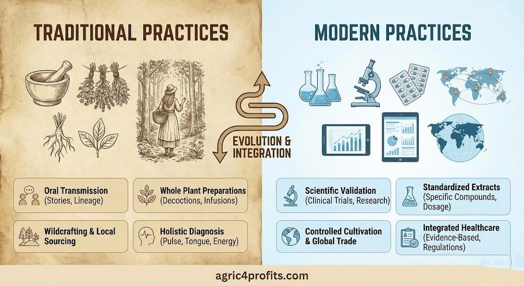 Les pratiques traditionnelles s’appuient sur les anciens systèmes culturels comme la médecine traditionnelle chinoise et l’Ayurveda pour la guérison et l’équilibre spirituel, tandis que les pratiques modernes qui intègrent la recherche scientifique, des extraits standardisés, et l’intégration avec la médecine conventionnelle.