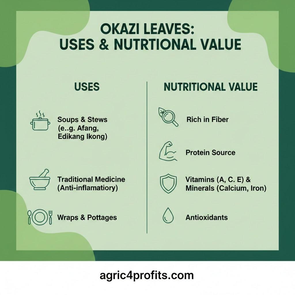Dans l’ensemble, okazi les feuilles sont d’un polyvalent et riche en nutriments des ingrédients qui ajoute une saveur unique et la texture de nombreux plats. Ils sont une grande source de vitamines et de minéraux, mais doivent être consommés avec modération en raison de leur teneur en oxalate.