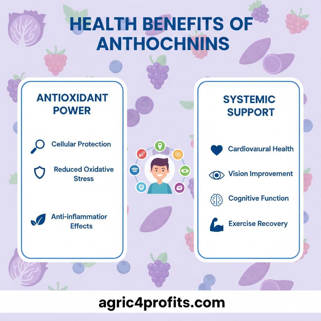 4. Cognitive Function: Anthocyanins enhance memory, improve general cognition, and help prevent age-related cognitive decline, with benefits observed in clinical trials and meta-analyses.