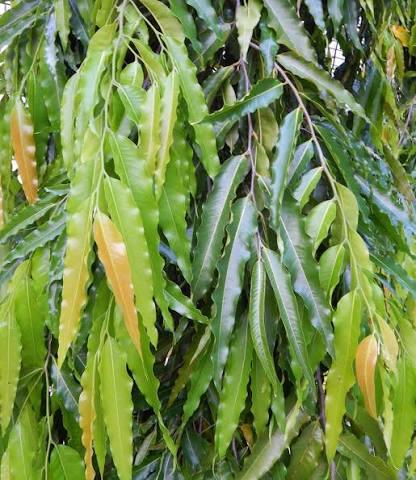 2. 叶子:阿育王树的叶子是深绿色的羽状复叶,在树枝上交替排列。每个小叶呈披针形,末端尖。